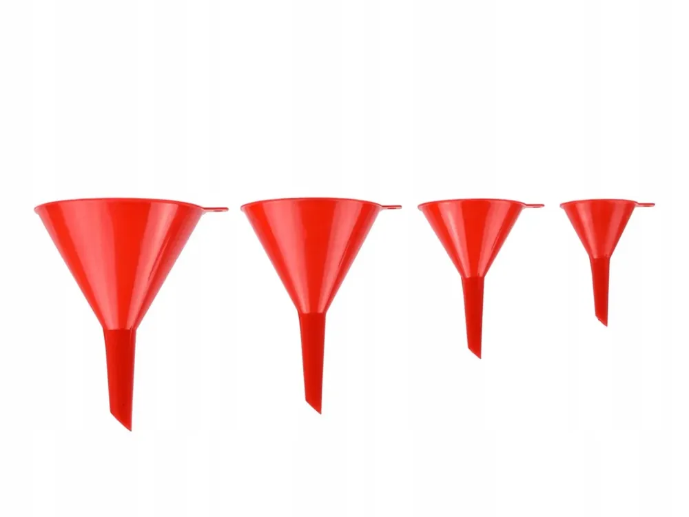 Zestaw lejków uniwersalnych w 4 różnych rozmiarach. Doskonale sprawdzą się w garażu jak i w ogrodzie. Niezastąpione podczas uzupełniania różnego rodzaju płynów eksploatacyjnych w pojazdach mechanicznych, a także w ogrodzie przy napełnianiu opryskiwaczy itp.